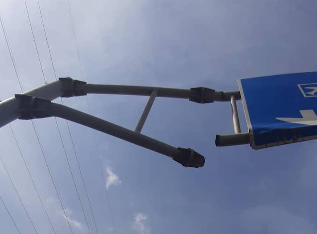 Certaines barres de fer sont déjà coupées, d’autres fortement endommagées (voir image). Vu son emplacement, sa chute peut provoquer des dégâts.